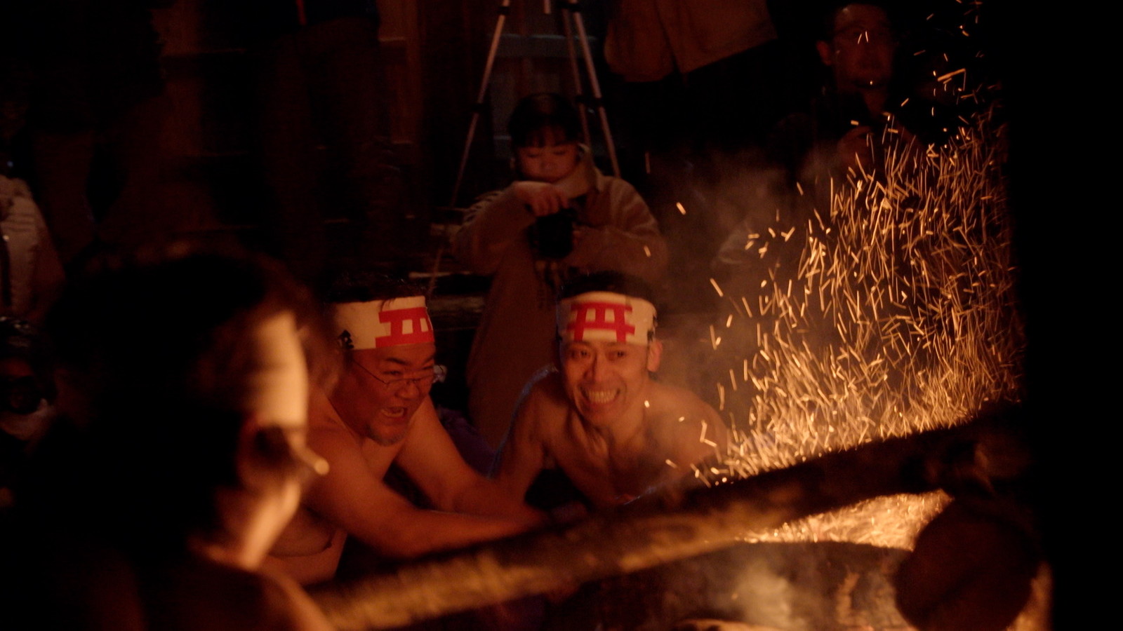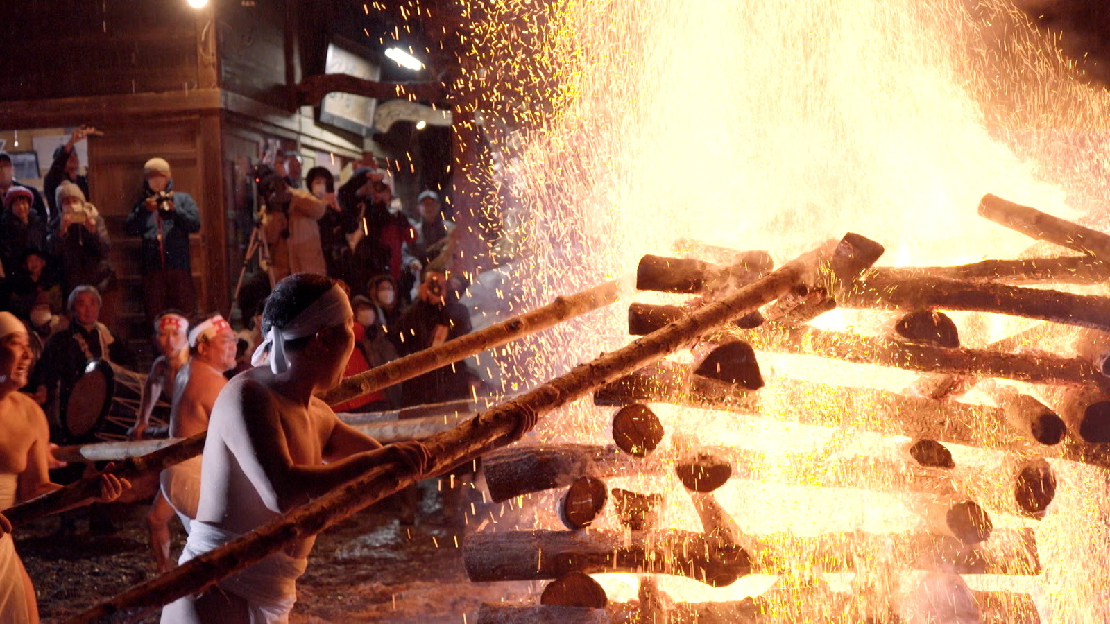 気温0度。裸となり冷水で身を清めたあと、火の粉を出すためにやぐらをたたく若衆が集まりました。