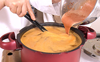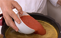 - とろみをつけるため、水でといた小麦粉にトマトペーストを加え入れる