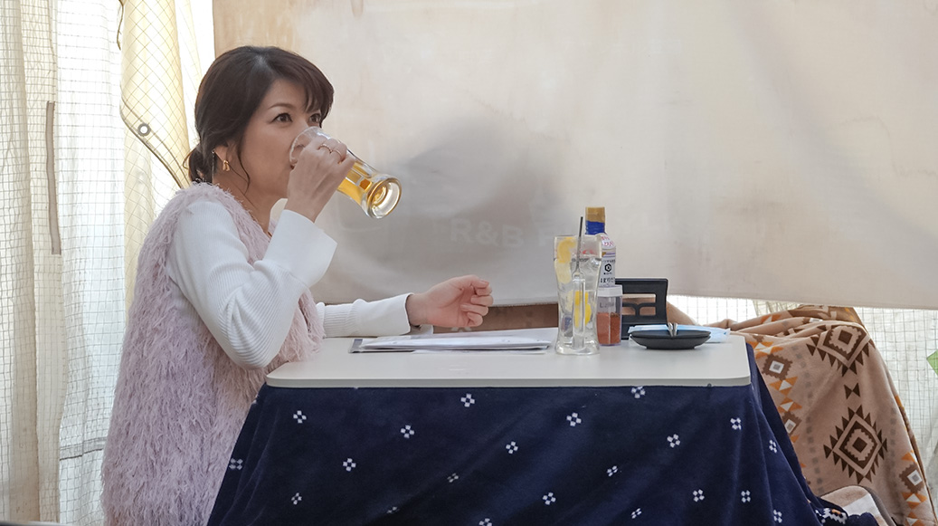 1軒目は、燻製(くんせい)料理が自慢の居酒屋さん。お客さんと一緒にこたつに入りながら、お酒を酌み交わす。
