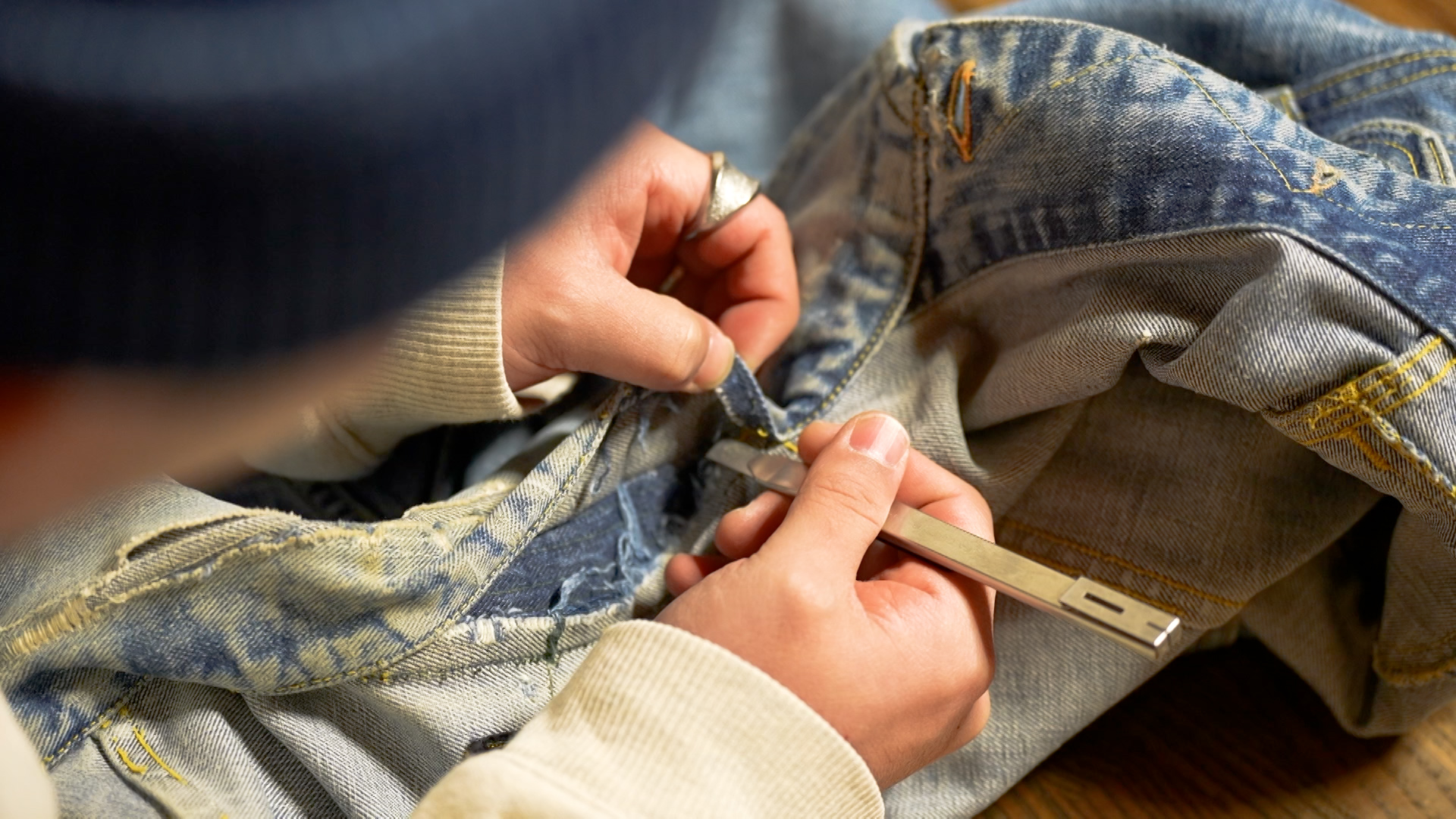 再生内容は永く着続けられるための補修がメイン。現在のダメージ感を残しつつ、ステッチの補修などを進めていく。