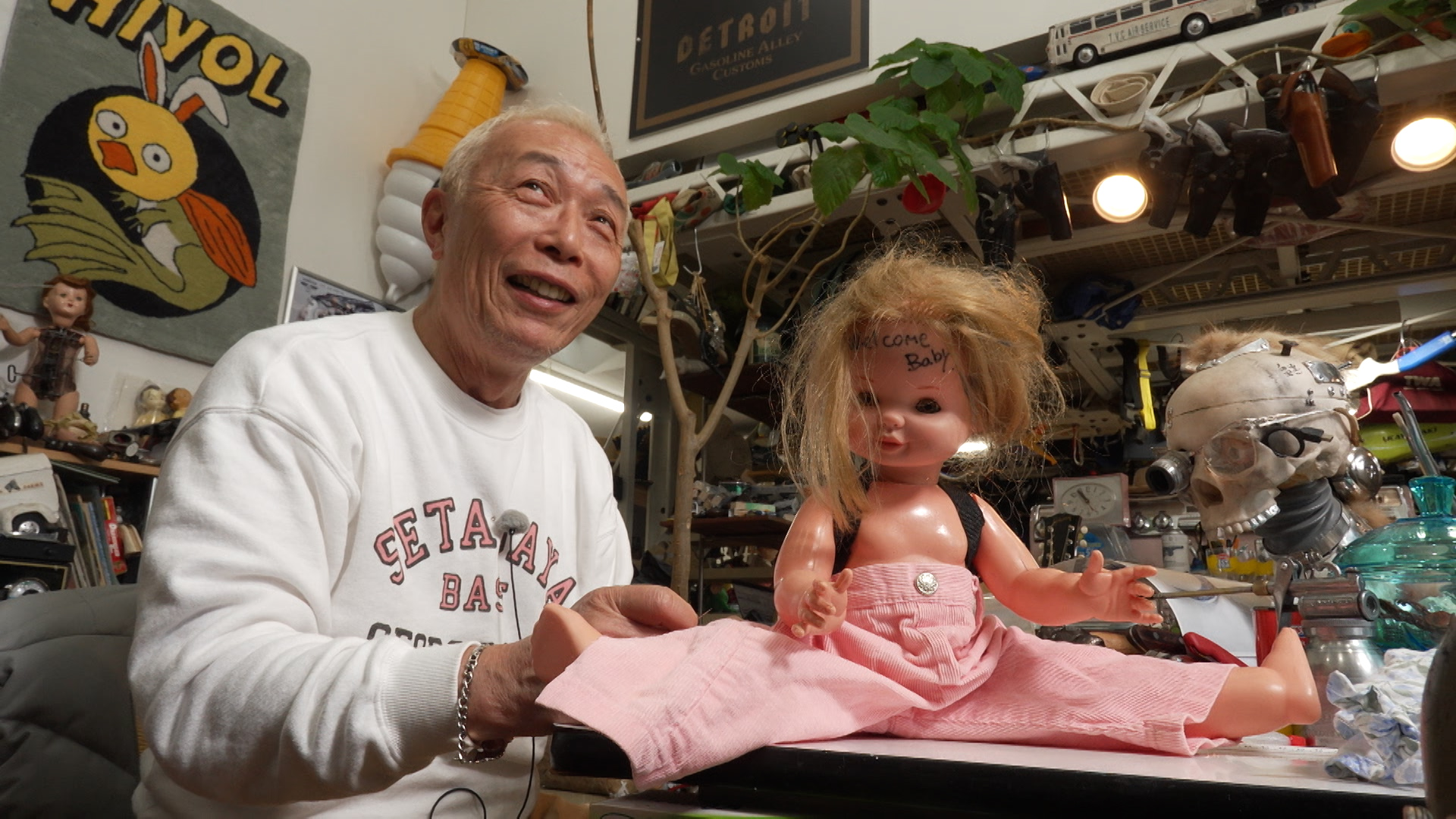 本日は図画工作の時間と題し扇風機のモーターを埋め込んだ首振り人形『Welcome Baby』に服を着せようと針と糸を取り出す所さん、果たして…。