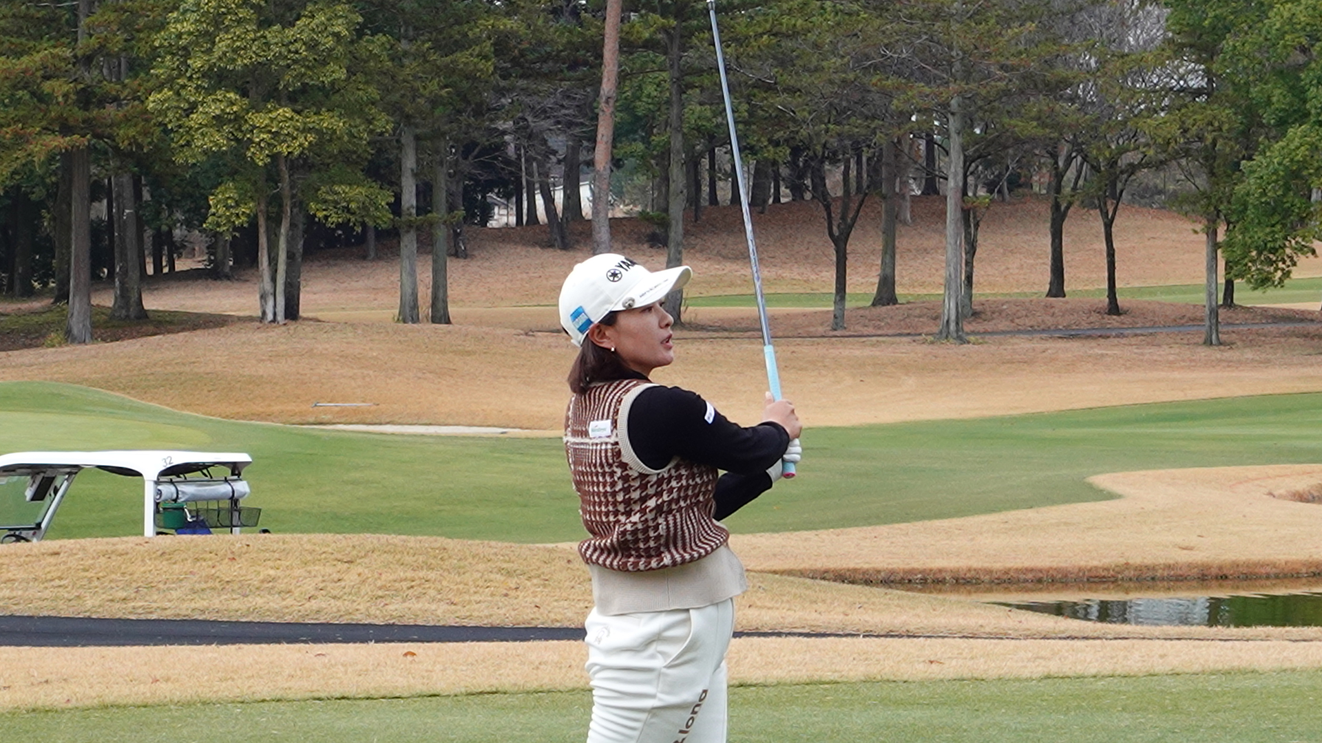 ティーショットは池越えとなり、その上を吹く風の読みが鍵を握る。